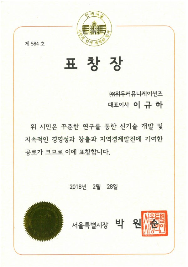 서울특별시장 표창장 페이지 정보 작성자 WeDu 댓글 0건 조회 7,228회 작성일 19-05-30 19:35 본문 2018-02-28 표창장 제 584호 신기술 개발 및 지속적인 경영성 창출, 지역 경제 발전 기여 서울특별시장 박원순 List Previous2018 소년한국 우수 어린이 도서 19.05.30 Next서울클러스터 어워드 우수상 19.05.30