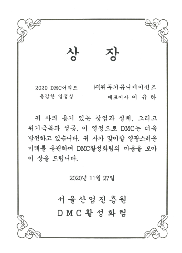 2020 서울산업진흥원 2020 DMC어워드 페이지 정보 작성자 WeDu 댓글 0건 조회 6,199회 작성일 21-12-31 12:57 본문 2020-11-27 2020 DMC어워드 용감한 열정상 서울산업진흥원 DMC활성화팀 List Previous2020 기술혁신 우수기업 21.12.31 Next2018 소년한국 우수 어린이 도서 19.05.30