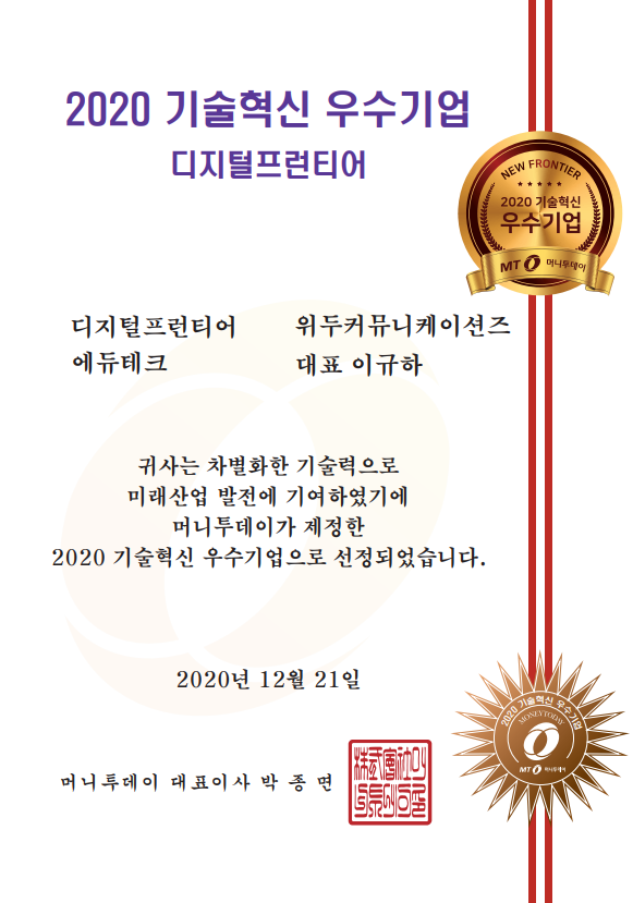 2020 기술혁신 우수기업 페이지 정보 작성자 WeDu 댓글 0건 조회 6,698회 작성일 21-12-31 12:58 본문 2020-12-21 2020 기술혁신 우수기업 디지털프런티어 에듀테크 머니투데이 대표이사 List Previous2020 소년한국 우수 어린이 도서 선정 21.12.31 Next2020 서울산업진흥원 2020 DMC어워드 21.12.31