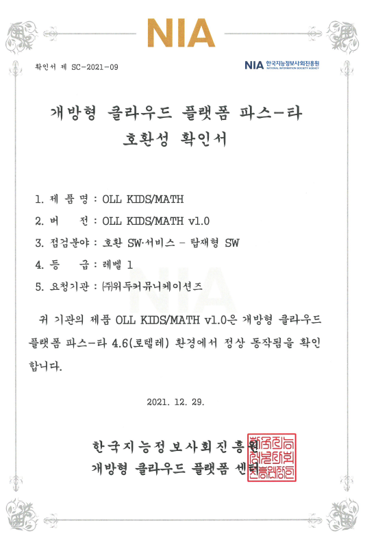 [한국/확인서] OLL KIDS/MATH 파스-타 호환성 확인서 페이지 정보 작성자 WeDu 댓글 0건 조회 11,037회 작성일 21-12-31 12:48 본문 2021-12-29 확인서 제 SC-2021-09 점검분야 : 호환 SW서비스 - 탑재형 SW List Next[한국/인증서] OLL KIDS/MATH 클라우드 서비스 확인서 21.12.31
