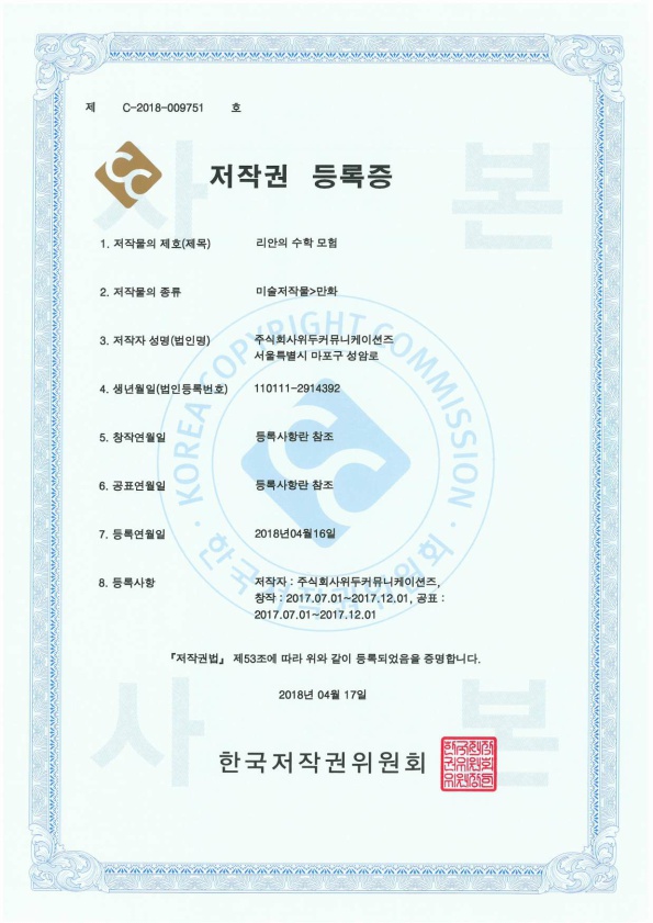 [한국/저작권] 리안의 수학 모험 페이지 정보 작성자 WeDu 댓글 0건 조회 6,516회 작성일 19-05-30 19:07 본문 2018-04-16 저작권 C-2018-009751 리안의 수학 모험 / 미술저작물>만화 List Previous[한국/저작권] 길리 19.05.30 Next[한국/저작권] 신입사원조기전력화 이러닝 콘텐츠 19.05.30